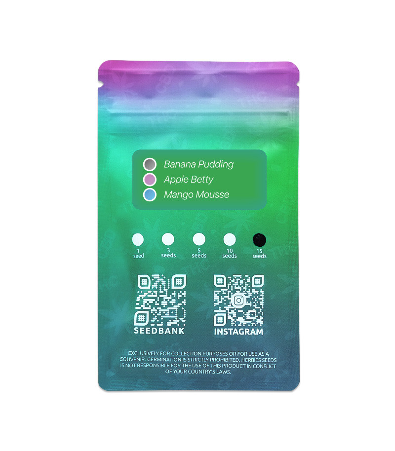 Микс семян каннабиса Dessert Mix от сидбанка Herbies Seeds – это прекрасная возможность познакомиться сразу с тремя растениями, обладающими потрясающим терпеновым профилем. Banana Pudding, Apple Betty и Mango Mousse являются гибридами с разной генетикой, но крайне схожими параметрами развития. Рост кустов колеблется в пределах 90-150 см. Они сильно кустятся, но хорошо реагируют на прищипывание и низкострессовые тренировки. Все три сорта удобно растить совместно в одном помещении, а снимать богатый урожай, достигающий коммерческого уровня, с этих красавиц можно будет спустя 55-65 дней цветения.