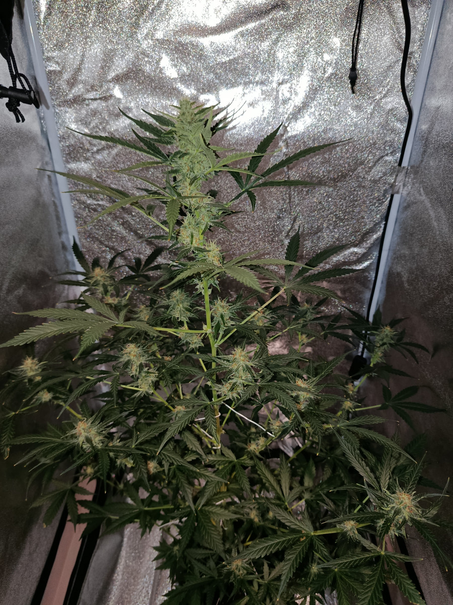 По итогу он упёрся в лампу на 800 мм и продолжал активно цвести в ширину, в росте остановился, так-как получается его прижало светом, что хорошо, но подгорела самая верхушка, поэтому я поставил вент на обдув и направил в верхушку, что бы не жечь ещё больше.
