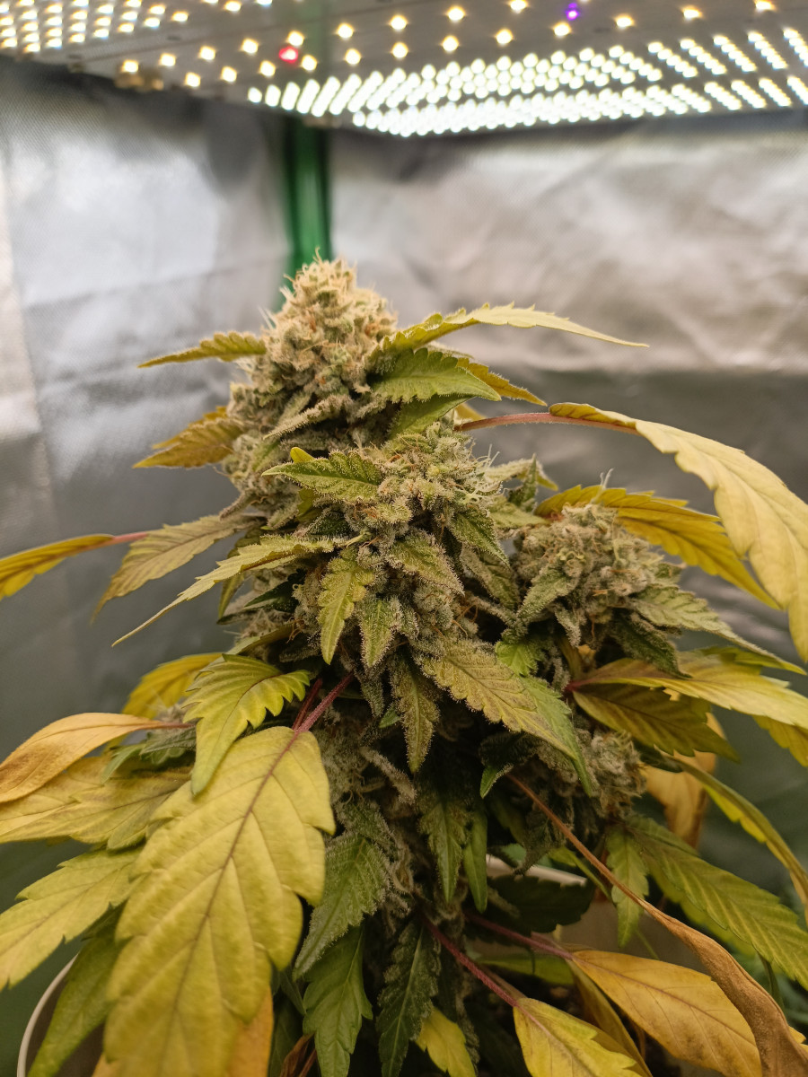 Это монстр силы! Так вышло, что из-за испортившейся погоды пришлось снимать урожай всего на 7 неделе цветения. Пусть вкус и запах оставили желать лучшего, но с ног сбивает уде мама не горюй. Отличная индика.