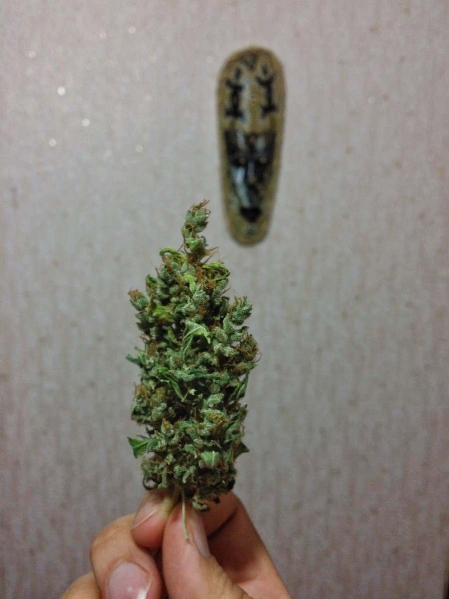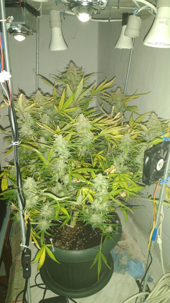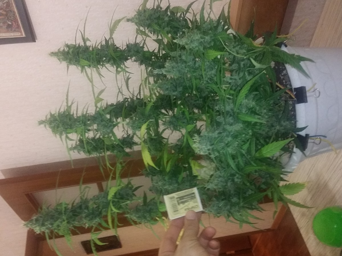Земля -70% с огорода, 30% с пакета (какую то в сарае нашёл,цветочную,магазинную, состав не знал), ни перлита, ничего такого..рыхлящего...Пролил всё это водой с крана (потом как выяснилось ппм кранной воды 342 у меня) до дренажа, и на следующий день семку кинул в землю (не проращивал заранее) на глубину примерно 2см.,накрыл сверху пластик.стаканом с дырочками и под прожектор "фито" 50Вт красно-синего спектра 660nm-450nm. Высота от земли до прожектора примерно см 50. Растиха вылезла примерно на 2-3 день. И как рванула вверх..глист см 8 и сверху 2 листика (пришлось вкрутить шурупы в горшок по периметру и натянуть капроновую нить,чтоб растиха не упала. Подсказали,что дело в свете. Накупил бытовых LED ламп 6400к по 25Вт 8 штук, снял с них плафоны и подвесил над растихой в 12-15 см от неё. Рост в высоту остановился и начала набирать в ширину. Потом на цвете поменял лампы на 2700к, у меня ещё появились к цветению 2 матрицы по 50Вт 3500к и полного спектра. Нормально всё так пошло. Поливал водой с крана и удобрами Biobizz Grow и Bloom. Перед харвом пролил до дренажа водой с крана ppm был 420 на выходе. Почти то,что нужно. Выдержал её 71 день. На 71-ый срубил (за 3 дня до рубки отключил ей свет и накрыл тёмной тканью, чтоб свет снаружи не проникал). Сейчас висит 2-ые сутки в сарае, сушится в холоде. И вот теперь она запахла очень вкусно)) Что то такое, сладкое с мятой что ли..не могу разобрать..Обрезал ей нижние листья, нанюхался так, что аж голова закружилась и ноги ватные стали))))Подошёл к зеркалу, зрачки расширенные сильно были)) Запах у неё реально адски мощный) .