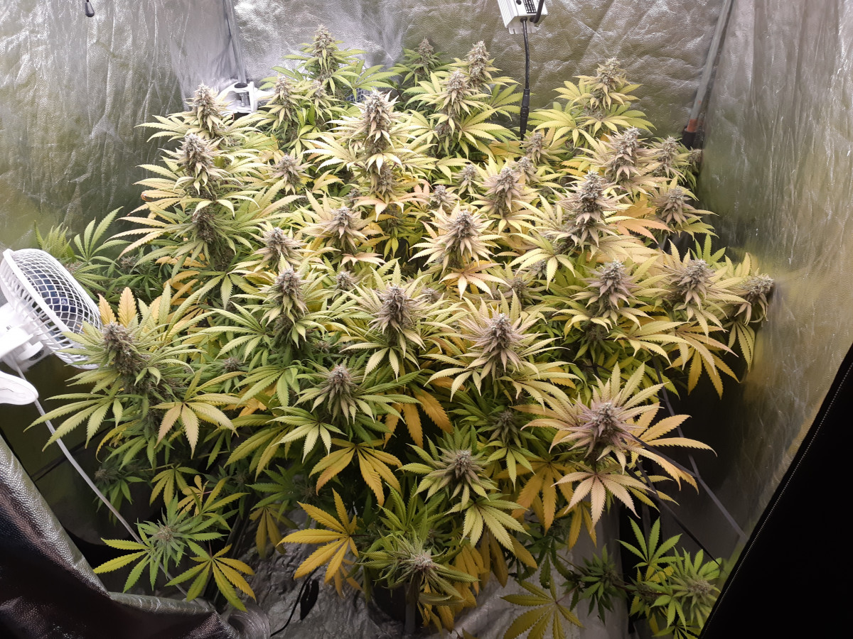 Если вы сделаете все правильно, можно сформировать очень правильную и пушистую крону. Я использую метод SCROG, который помогает растению укрепить свои ветви перед цветением, но это, вероятно, не обязательно, поскольку кусты формируют сильные побеги, которые способны удерживать бутоны самостоятельно. Пурпурно-красные листья стали темно-пурпурными к 50-му дню. Я провел свой первый харвест на 60-й день и собрал второй урожай на 63-й день, но не было заметной разницы в качестве.