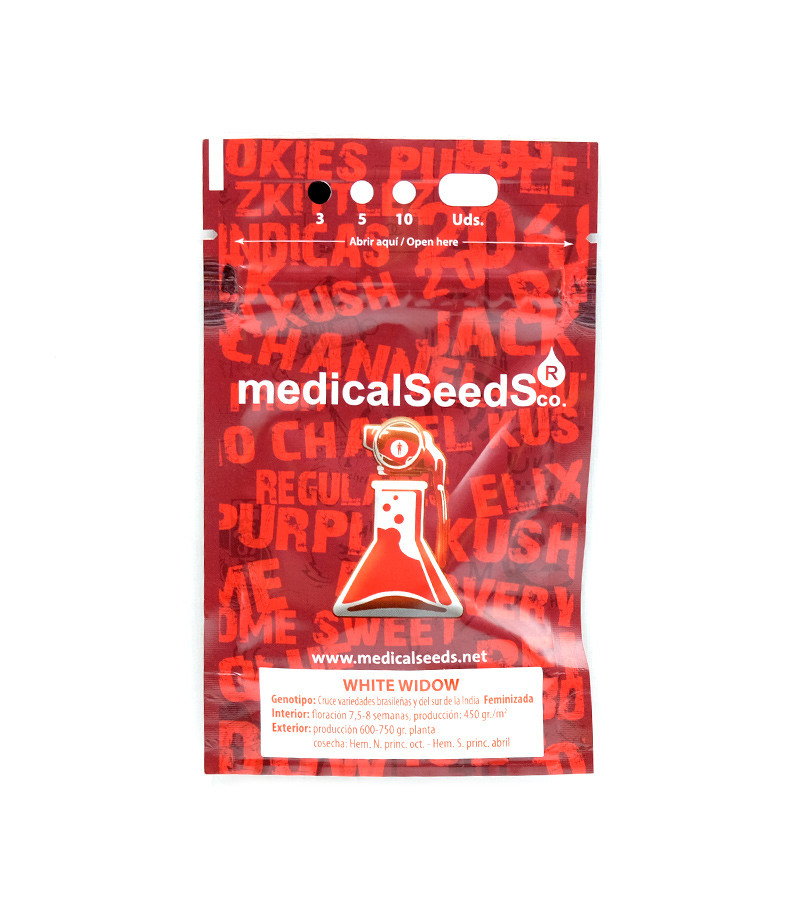 Семена конопли White Widow от сидбанка Medical Seeds не нуждаются в рекламе. Растишка славится своей неприхотливость, устойчивостью к негативным факторам внешней среды, быстрым периодом цветения в 7-8 недель и убойным расслабляющим воздействием. Шишки имеют травяной вкус и цветочный аромат.